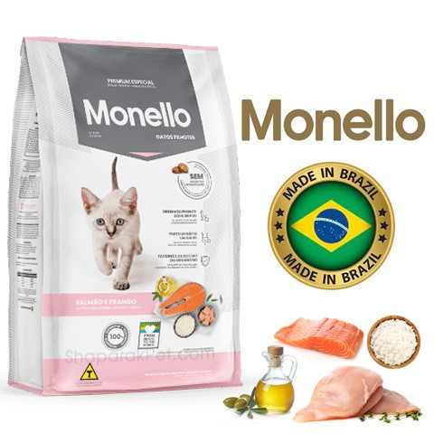 غذای خشک بچه گربه مونلو (Monello) تهیه شده از ماهی سالمون و مرغ فاقد رنگ ها و طعم دهنده های مصنوعی است. پروتئین های با کیفیت، فرمول حاوی مخمر آبجو و مانان-الیگوساکارید (MOS) است، یک پری بیوتیک که جذب مواد مغذی را افزایش می دهد و بر سلامت روده تأثیر می گذارد. این غذا حاوی تورین، یک اسید آمینه ضروری است که مستقیماً بر سلامت بینایی و قلب گربهها تأثیر میگذارد و رشد عاری از بیماریهای ناشی از کمبود این ماده را تضمین میکند. غذای گربه مونلو تولید کشور برزیل است.